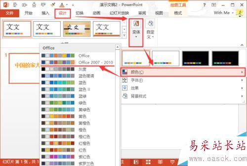 7、成功設(shè)置后,后來自行摸索,發(fā)現(xiàn)還有一個更加便捷設(shè)置主題顏色的方法,依次在菜單欄中點擊“設(shè)計”→“變體“→“變體最右邊的箭頭”→“顏色”→“Office 2007-2010”,設(shè)置后,仍然能將顏色主題設(shè)置為標準色。