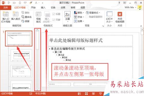 3、進入“幻燈片母版”之后,在左側(cè)會有很多母版,將左側(cè)滾動條,向上滾動至頂端,并點擊最頂上一頁的PPT母版。