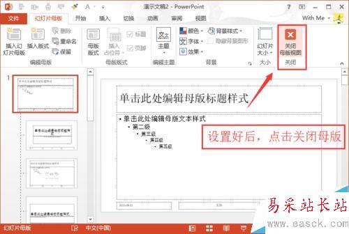 5、設(shè)置好了之后,點擊“關(guān)閉母版視圖”即可退出幻燈片母版界面。備注:不少朋友設(shè)置,不知道怎么退出幻燈片母版,特此強調(diào)!