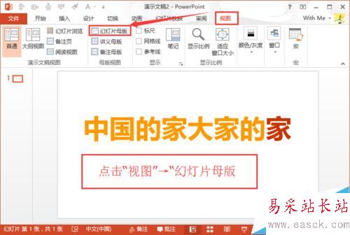 2、先選中任意文字后,在菜單欄中,找到“視圖”,并點擊“幻燈片母版”。