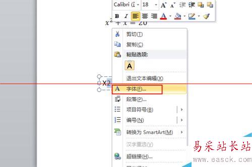 6、小編再說一個方法,還是先插入橫排的文本框,直接輸入x2表示x^2,然后選中2再右擊,選擇“字體”