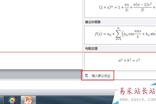 2、在插入里面找到“公式”點擊,打開公式的下拉列表,如果你輸入的不是系統(tǒng)內(nèi)置的這些現(xiàn)成的公式,那么點擊最后一項“插入新公式”