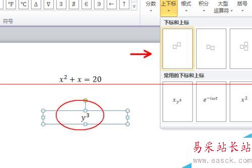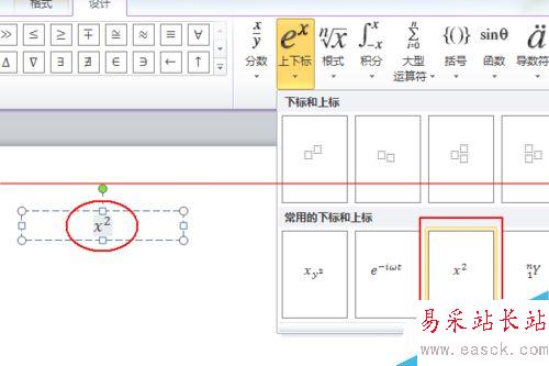 3、切換到公式編輯選項卡,選擇上下標,點擊紅框位置即常用上下表中的第三個,這樣可以直接輸入x的平方