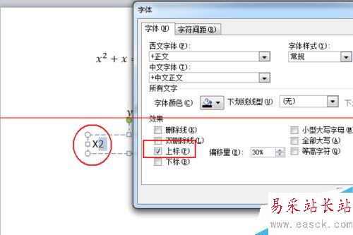 7、在字體設置窗口,點擊選擇“上標”,這樣這個2就會自動變到右上角的位置。