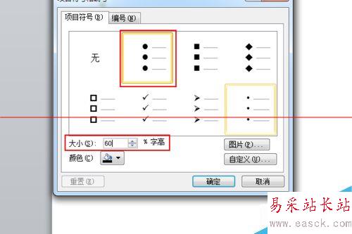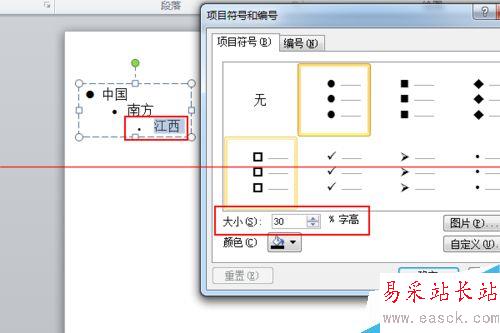 7、打開“項目符號和編號”,設置符號大小為30%字符,點擊確定,這個數字設置的比較小了,實際設置的時候,要整體配合
