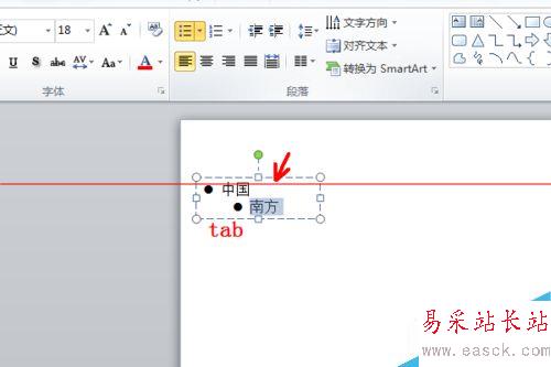3、這樣中國二字前面就添加了黑點了,接著回車輸入“南方”,將光標移動到南字前面,按Tab鍵空兩格錯開位置形成層級