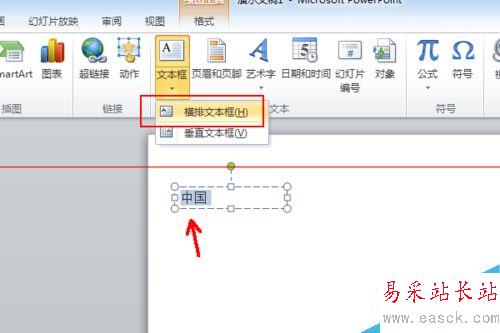 1、首先清空版面,當然如果你已經插入圖片或者是輸入了其他內容可以不用清理,點擊插入——文本框,插入一個橫向的文本框,輸入文字“中國”,小編這里分級說明