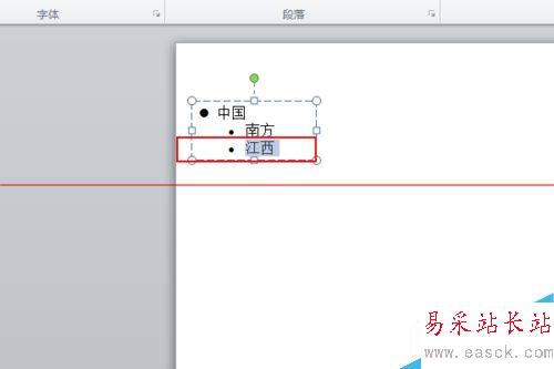 2、選中文本框里面的“中國”二字,切換到“開始”,點擊段落面板里面左上角的第一項,如圖所示位置,打開項目符號設置,選擇左起的第二個,黑色實心圓點符號