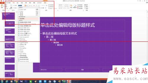 5、PPT默認(rèn)字體為宋體,在母版紅,你也可以選擇自己喜歡的字體進(jìn)行更改。方法為,點(diǎn)擊開始菜單,選中文本框,對(duì)字體進(jìn)行調(diào)整(如圖,我選擇了自己比較喜歡的微軟雅黑)