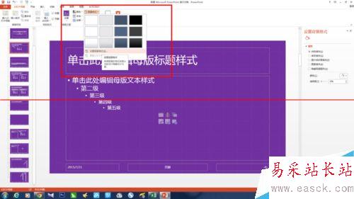 4、選中母版幻燈片1,點(diǎn)擊“背景樣式”→設(shè)置背景格式,在這里,可以對(duì)幻燈片背景色進(jìn)行設(shè)置(如圖,我選擇了紫色)