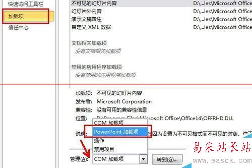 4、在左側(cè)邊欄里面點(diǎn)擊“加載項(xiàng)”,點(diǎn)擊“管理”后面的小框打開列表選擇“PowerPoint加載項(xiàng)”然后點(diǎn)擊“轉(zhuǎn)到”