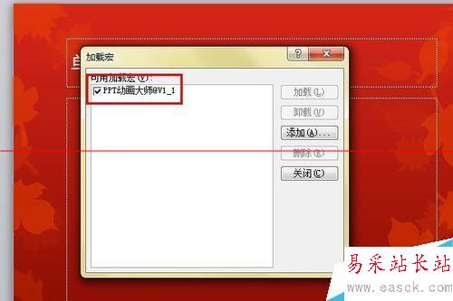 6、回到加載宏設(shè)置窗口,我們可以看到列表里面已經(jīng)出現(xiàn)ppt動畫大師并勾選了,點(diǎn)擊關(guān)閉,ppt頂端會出現(xiàn)加載宏的選項(xiàng),點(diǎn)擊就可以看到我們安裝的插件了