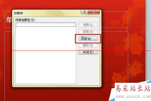5、接著出現(xiàn)加載宏窗口,點(diǎn)擊“添加”,ppt會默認(rèn)打開addins文件夾所在的位置,選擇ppt動畫大師插件,點(diǎn)擊“打開”,這就是一開始改變插件位置的原因,當(dāng)然在其他文件夾也可以,只要便于管理就可以了