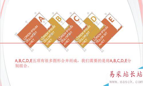 1、插入圖形后,發現A,B,C,D,E五項有很多圖形合并而成,我們需要的是將A,B,C,D,E分別組合。