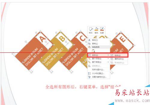 3、然后我們用同樣的方法進行組合-右鍵菜單選擇組合。將所有的A,B,C,D,E項分別組合完成。確保只有每個組合中的圖形不要漏組。