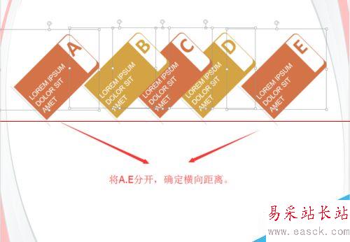 6、這時,以A項為起點,E項為終點,這段距離中所有的組合均勻橫向分布。呈現出如圖的效果。