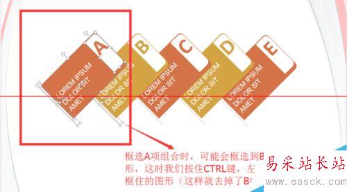 2、框選A項進行組合,這時我們可能會框選到B項中的圖形,這時我們按住CTRL鍵,左鍵點擊下B項中框住的圖形(這樣就去掉了B中圖形)