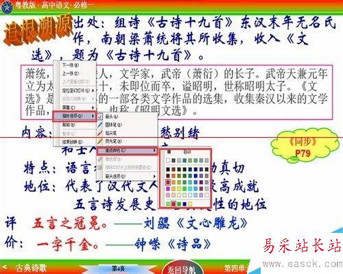 5、指示筆的顏色是可以設置的。幻燈片播放過程中,鼠標右單擊,在出現的對話框中點”指針選項“,右下拉框中選”墨跡顏色“。