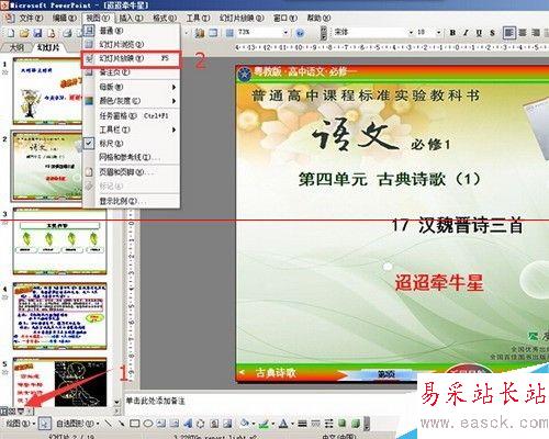 1、制作完成PPT,點擊播放幻燈片。打開PPT,單擊左下角幻燈片放映的圖標,或者在菜單欄中點擊“視圖”——“幻燈片放映”,這樣就可以播放幻燈片了。