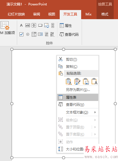 接下來切換到“開發(fā)工具”選項卡,點擊工具欄上的文本框ActivX控件按鈕(帶ab符號的圖標(biāo)),然后在幻燈片上畫出一個文本框控件。右擊控件框,從右鍵菜單中選擇“屬性表”。