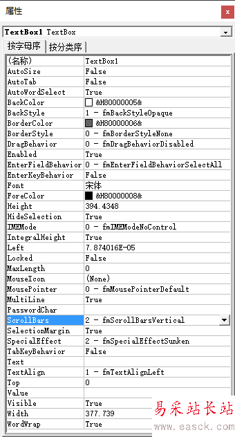在打開的屬性表窗口,將MultiLine設(shè)置為“True”表示文字可以自動回行,將ScrollBars設(shè)置為“2-fmScrollBarsVertical”表示啟動滾動條。關(guān)閉屬性窗口,一個帶滾動條屬性的文本框就設(shè)置完成啦。