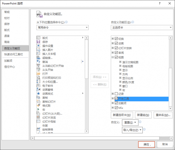 使用PowerPoint 2016的朋友,如果沒有顯示“開發(fā)工具”選項卡,請先點擊“文件→選項”打開選項對話框,點選左側(cè)“自定義功能區(qū)”,再在右側(cè)選中“開發(fā)工具”,確定即可。