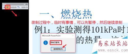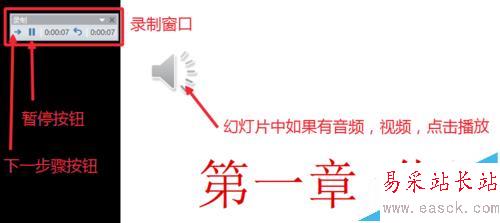 4、這時候進入幻燈片播放模式,左上角有個按鈕,我們可以點擊這里的箭頭控制幻燈片的放映,當(dāng)然也可以直接在幻燈片上點擊播放,大家要記住,如果幻燈片中有音頻或者視頻,這時候可以按照你上課的步驟點擊播放即可。錄制過程中臨時有事情,我們可以暫停幻燈片的播放,直到自己繼續(xù)錄制開始。如圖所示自己操作即可。