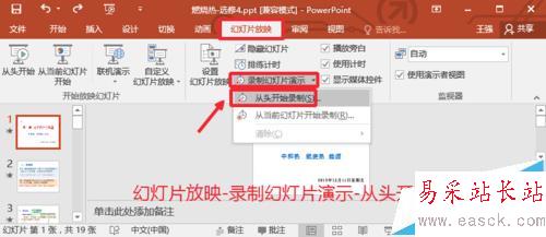 2、打開以后,點擊幻燈片放映按鈕,然后點擊錄制幻燈片演示,點擊這里的小箭頭,然后點擊這里的從頭開始錄制按鈕,如圖所示打開即可。