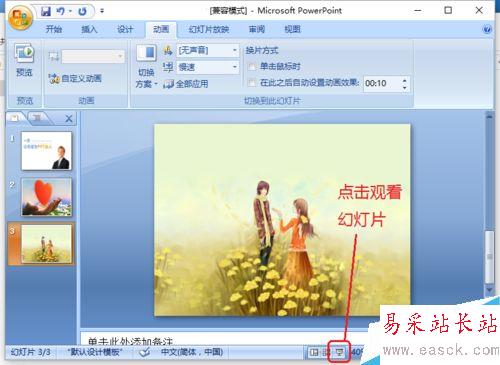 5、設定之后點擊“觀看幻燈片”按鈕,看看幻燈片是不是按照我們設定的時間來自動播放的。