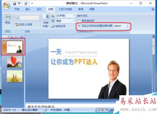 2、在動畫的下面,我們需要勾選“在此之后自動設置動畫效果”,然后在后面設定時間,注意,設定的這個時間就是這個幻燈片停留的時間。現在我們設定的是第一張幻燈片的時間。