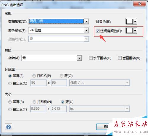 2、點(diǎn)擊“保存”按鈕后,會出現(xiàn)“PNG輸出選項(xiàng)”彈窗,勾選“透明度顏色”選擇框,點(diǎn)擊“確定”按鈕