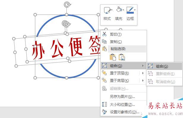 將遮罩矩形的填充色和邊框線全都設(shè)置成與背景色相同的顏色,這樣它看起來就“消失”了,即可實(shí)現(xiàn)一個(gè)不連續(xù)線條的圓形。可以將不續(xù)線的圓形、遮罩矩形、文字組合成一個(gè)整體。