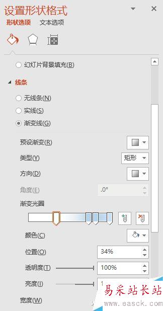 上述方法,在有圖形背景的情況下,作為遮罩的白色矩形會(huì)顯示出來,從而破壞畫面美感,在這種情況下,可右擊白色矩形,選擇“設(shè)置形狀格式”,在填充部分選擇“幻燈片背景填充”,這時(shí)白色矩形既會(huì)“隱身”,同樣又能切割線條。