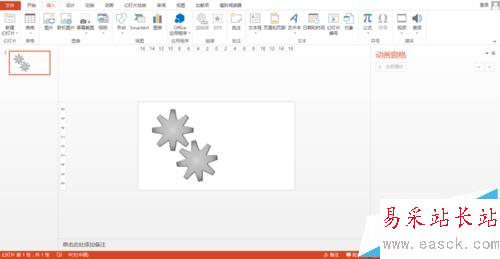 1、首先,首先,打開Microsoft PowerPoint,在頁面中畫上一個齒輪。然后在復制+粘帖,這樣我們就得到了兩個齒輪。