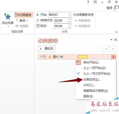 4、我們在動畫窗格中看到一個帶著小鼠標的一行文字,那個就是代表著齒輪A的動作,我們那一行上鼠標右鍵——效果選項。