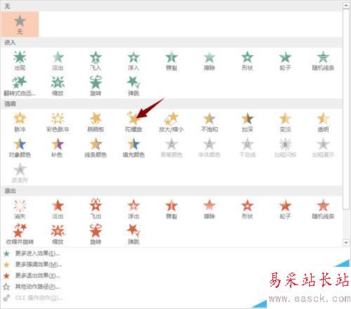 2、將其中的一個齒輪選中(暫且將它編號為A),A齒輪選中之后,點擊菜單欄中的“動畫”,在動畫下拉菜單中找到“強調”——“陀螺旋”。