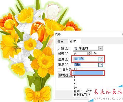5、右鍵點(diǎn)擊該效果,選擇“計(jì)時(shí)”,速度欄里輸入0.8秒,重復(fù)欄選擇2。