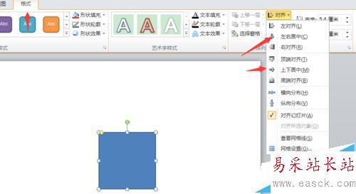 3、調整圓角矩形位置,另其在幻燈片中上下左右居中對齊。方法:格式——對齊——左右居中——對齊——上下居中,如圖