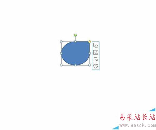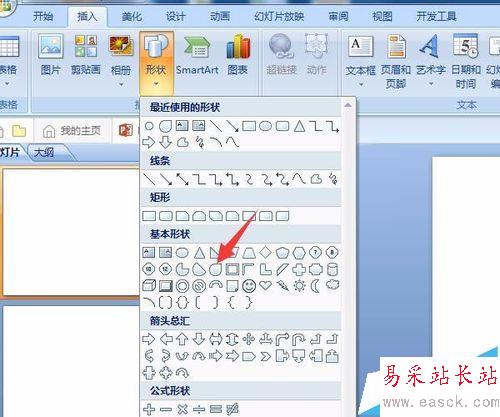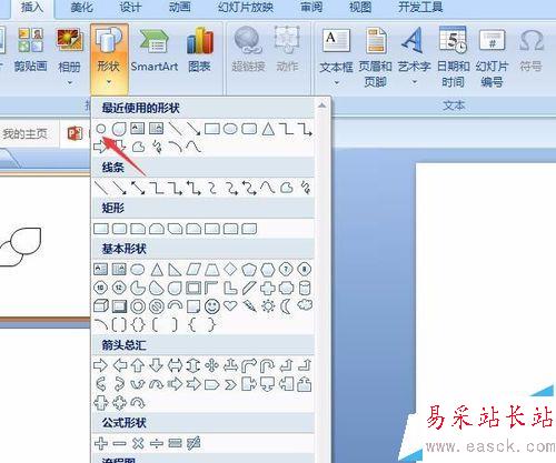 2、畫小鳥的翅膀。選擇導航欄上的插入,選擇水滴形狀的圖案,然后點擊,在空白幻燈片上畫出這個圖案,對圖案進行如下的位置調整。
