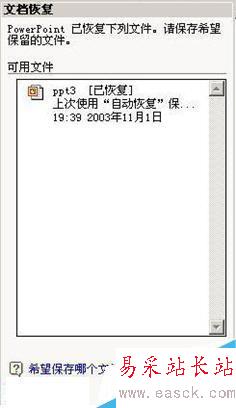 一旦出現死機或停電等意外情況后,當再次啟動PPT時,系統會自動打開一個“文檔恢復”工具欄,將丟失的文稿顯示出來,選擇其中需要的文稿,然后將其保存起來即可。