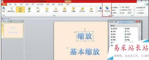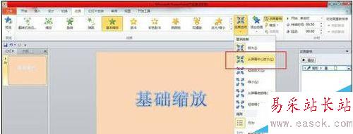 4、點(diǎn)擊”基礎(chǔ)縮放“,然后點(diǎn)擊“動(dòng)畫(huà)”→“基礎(chǔ)縮放”,適當(dāng)調(diào)整時(shí)間、縮放大小,可以看到縮放是從幻燈片的中心開(kāi)始縮放的