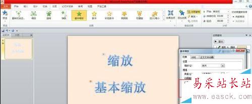 5、雙擊右邊動(dòng)畫(huà)窗口里面的“基礎(chǔ)縮放”效果,彈出窗口后,設(shè)置“動(dòng)畫(huà)文本”,如果設(shè)置為“整批發(fā)送”,字體就是一起縮放的,如果設(shè)置為“按字母”,字體就是一個(gè)一個(gè)出現(xiàn)的