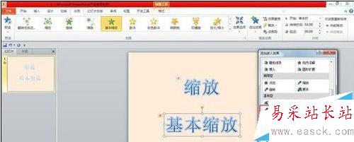 3、選中”縮放“,點(diǎn)擊“動(dòng)畫(huà)”→“縮放”,然后設(shè)置好時(shí)間,縮放大小等,可以看到是以縮放為中心進(jìn)行縮放的,是全部字一起出現(xiàn)