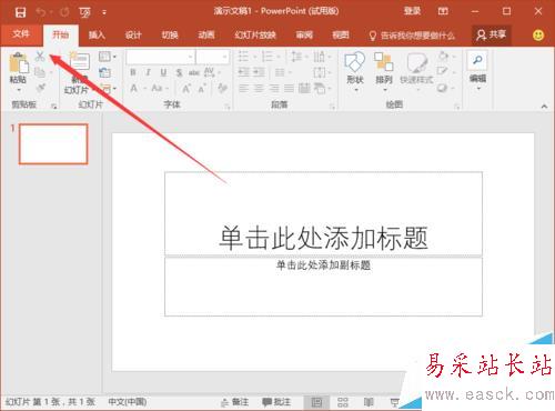 2、在打開的ppt文檔窗口中,點擊左上角的“文件”命令選項。如圖所示;