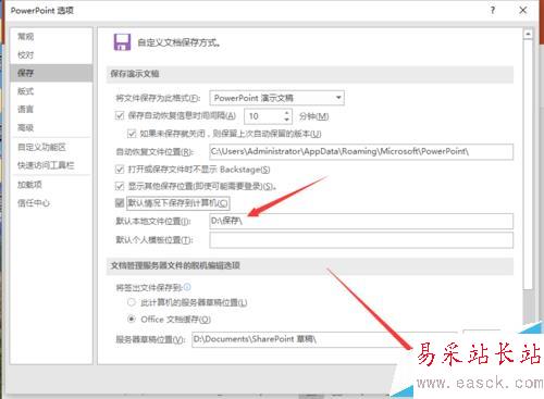 6、在“保存”選項右側窗格中,找到“保存演示文稿”區域下的“默認本地文件位置”并在其中進行修改,然后再點擊“確定”按鈕即可。如圖所示;