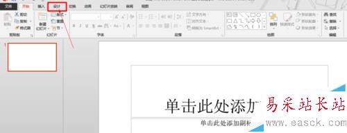 1、首先,請大家啟動PPT軟件,然后在PPt軟件的編輯第一頁選擇“設計”選項卡。