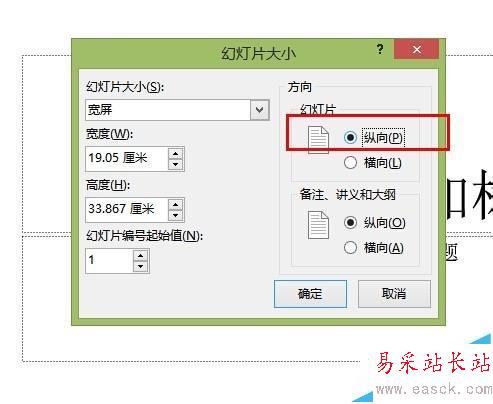 4、然后我們會在這一步中看到一個彈出的選項界面,需要我們進行選擇,我們在這里將幻燈片的版式選擇為”縱向“,點擊確定。