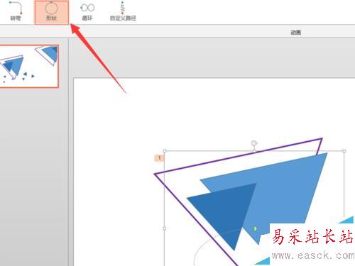 4、選擇需要添加動畫的圖形,左鍵單擊選擇動畫菜單欄下的“形狀”按鈕;