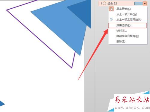 5、右鍵單擊右側“動畫窗格”下的“組合”按鈕,選擇“效果選項”;