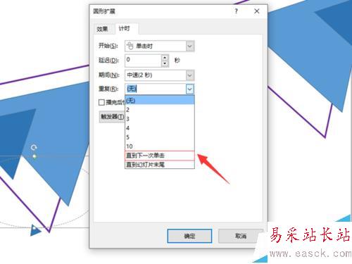 6、左鍵單擊計時菜單欄下重復按鈕右側的下三角按鈕,選擇“直到下一次單擊”,完成圖形的動畫循環播放制作;